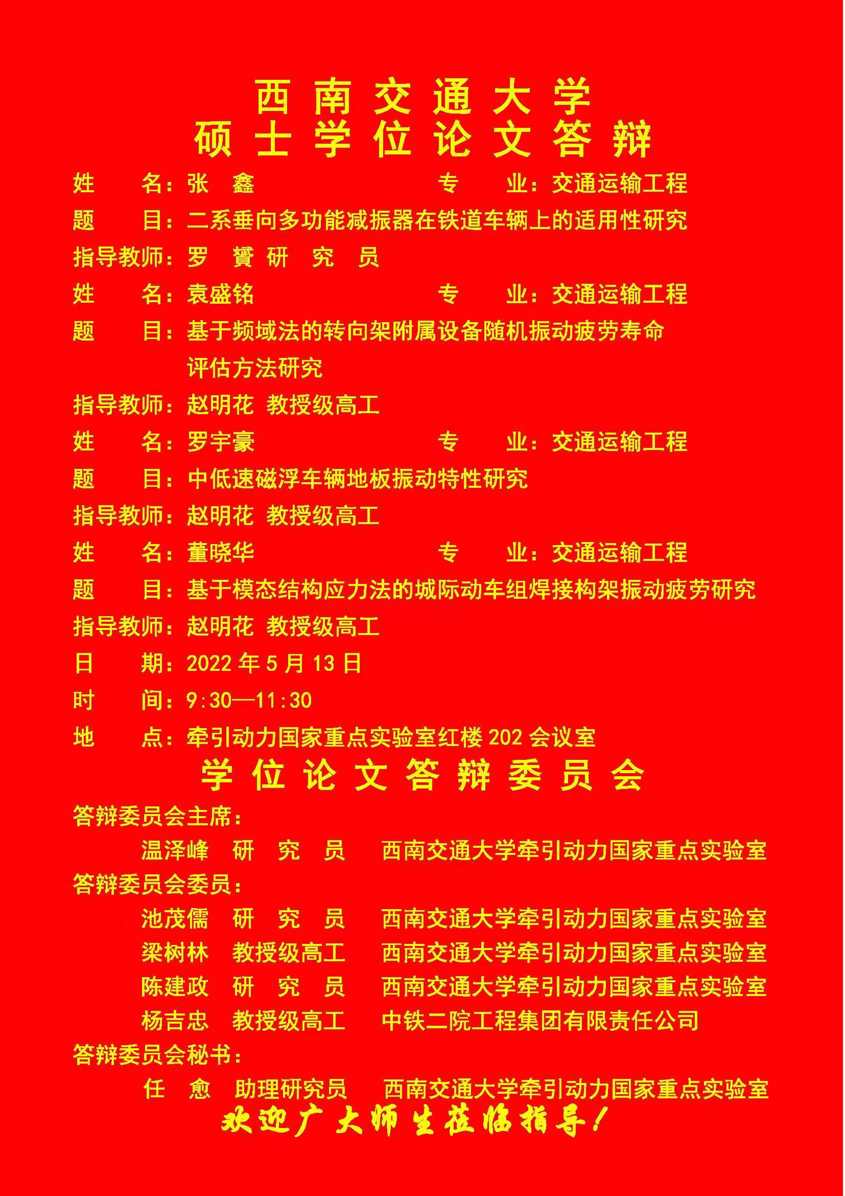 西南交通大学张鑫、袁盛铭、罗宇豪、董晓华硕士学位论文答辩