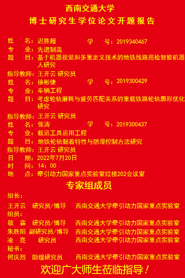 西南交通大学迟胜超、徐彬倢、张涛博士学位论文开题报告