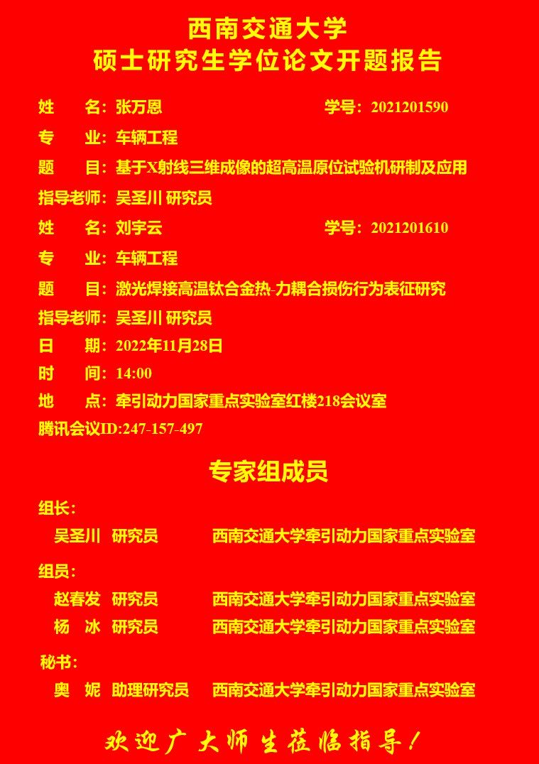 西南交通大学张万恩、刘宇云硕士研究生学位论文开题报告