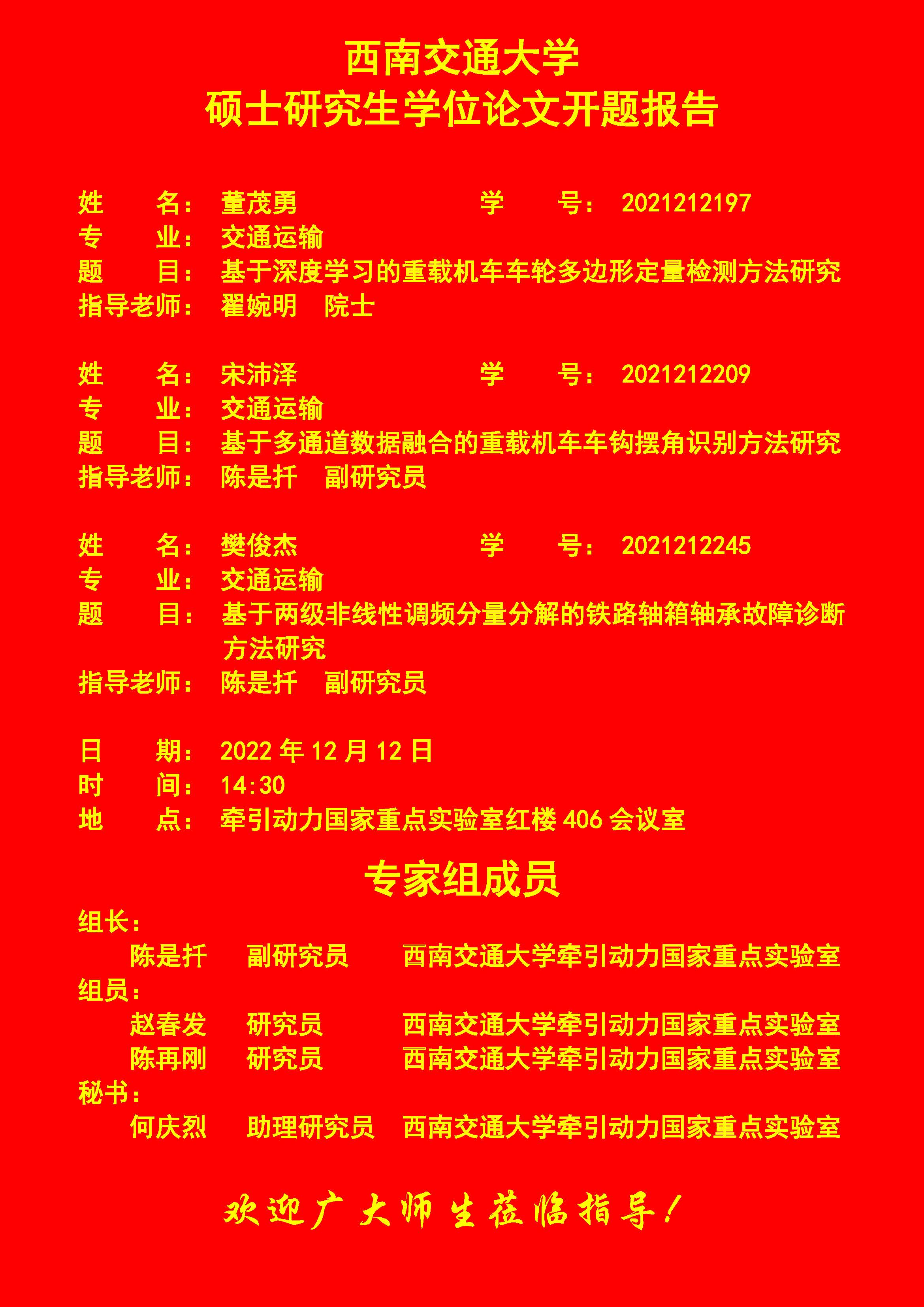 西南交通大学董茂勇、宋沛泽、樊俊杰硕士研究生开题报告