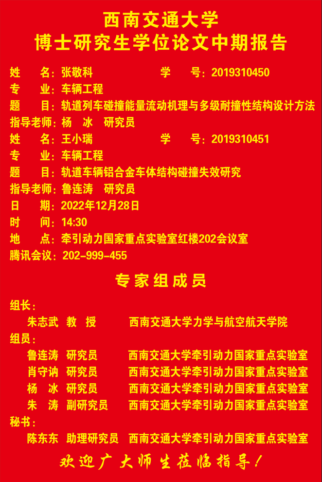 西南交通大学张敬科、王小瑞博士研究生学位论文中期报告