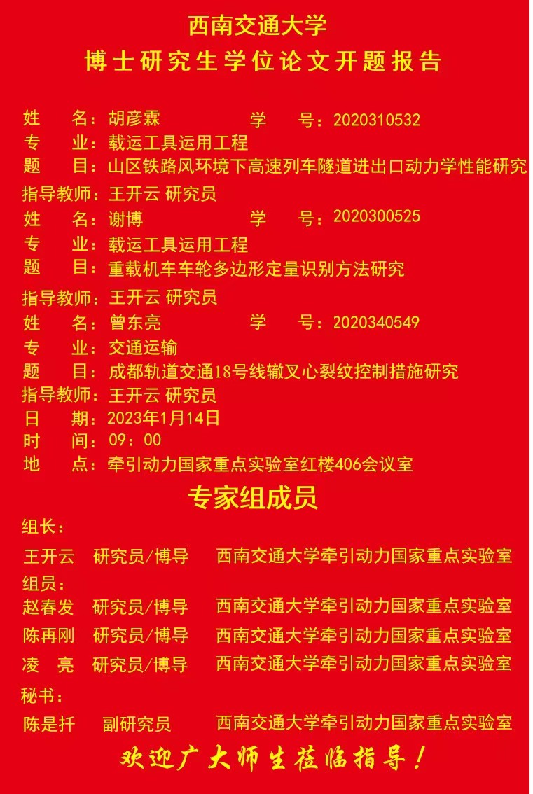 西南交通大学胡彦霖、谢博、曾东亮博士研究生学位论文开题报告