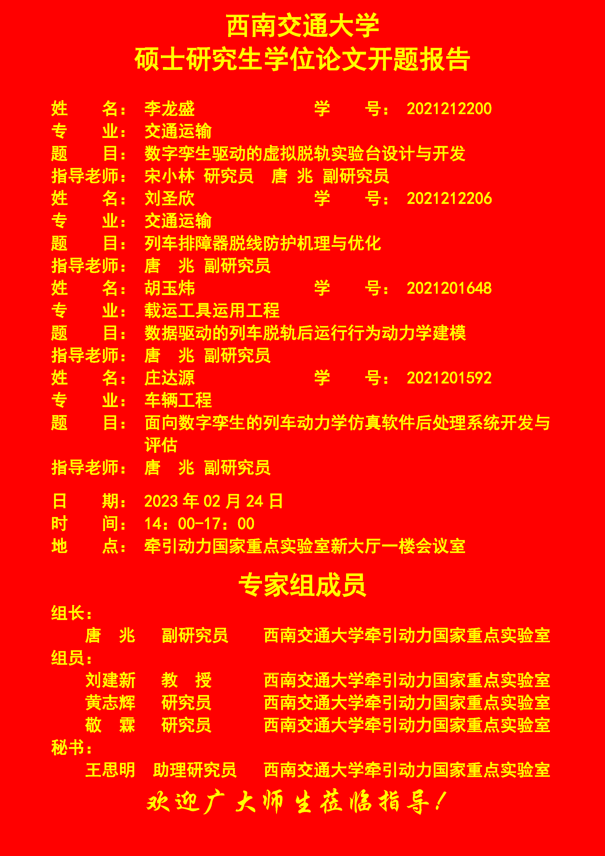 西南交通大学李龙盛、刘圣欣、胡玉炜、庄达源硕士研究生开题报告