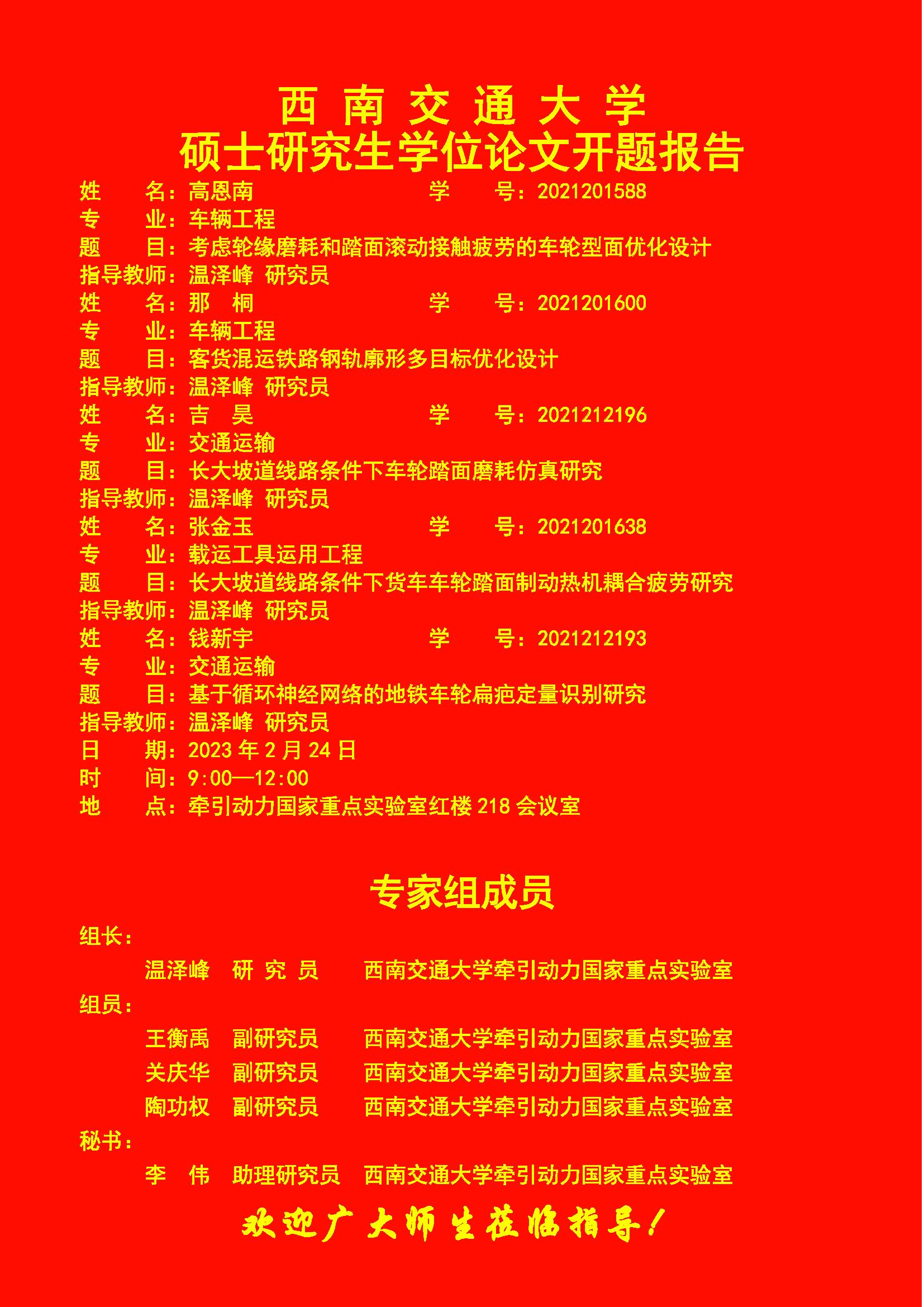 西南交通大学高恩南、那桐、吉昊、张金玉、钱新宇硕士研究生学位文论开题报告