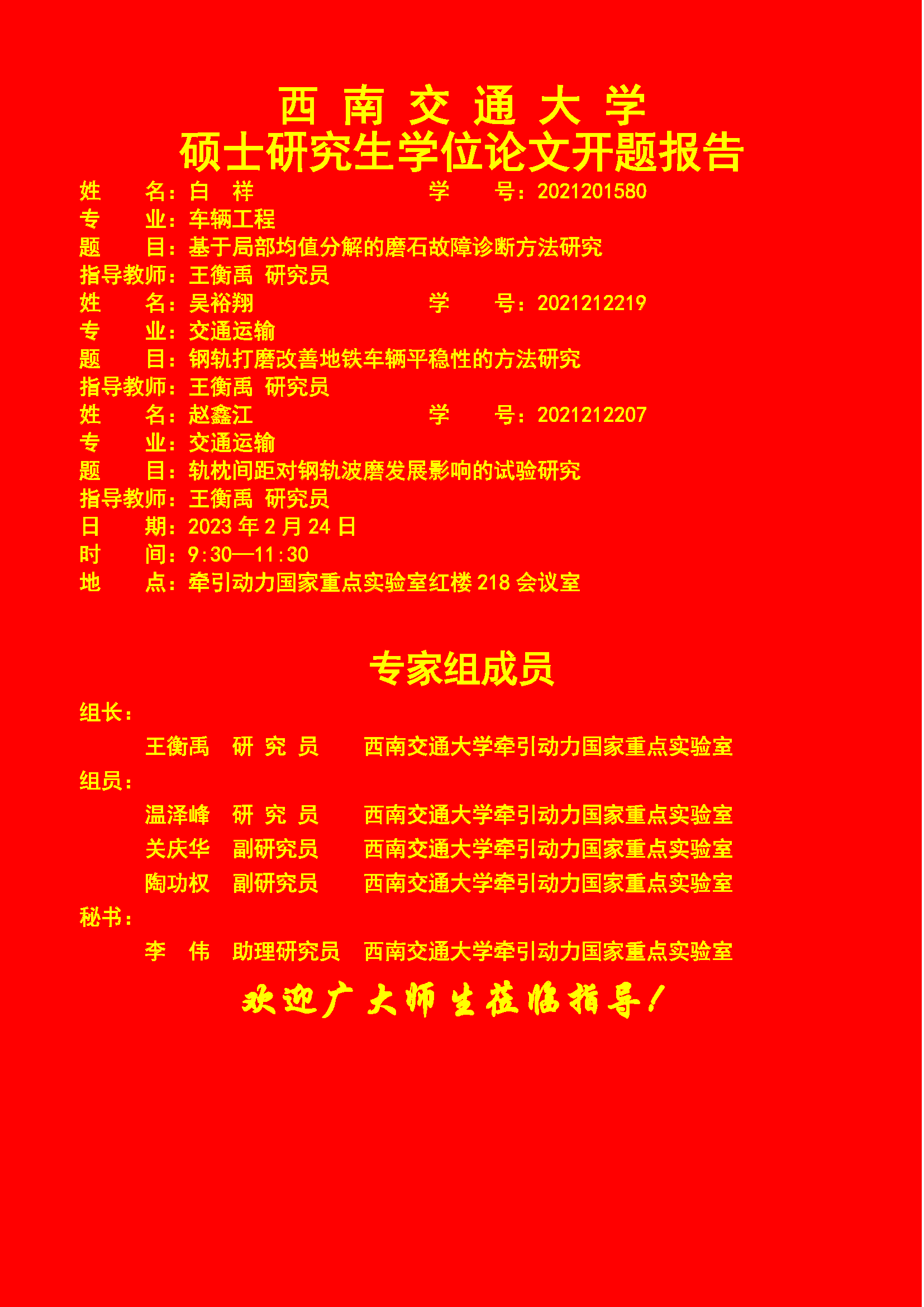 西南交通大学白祥、吴裕翔、赵鑫江硕士研究生开题报告