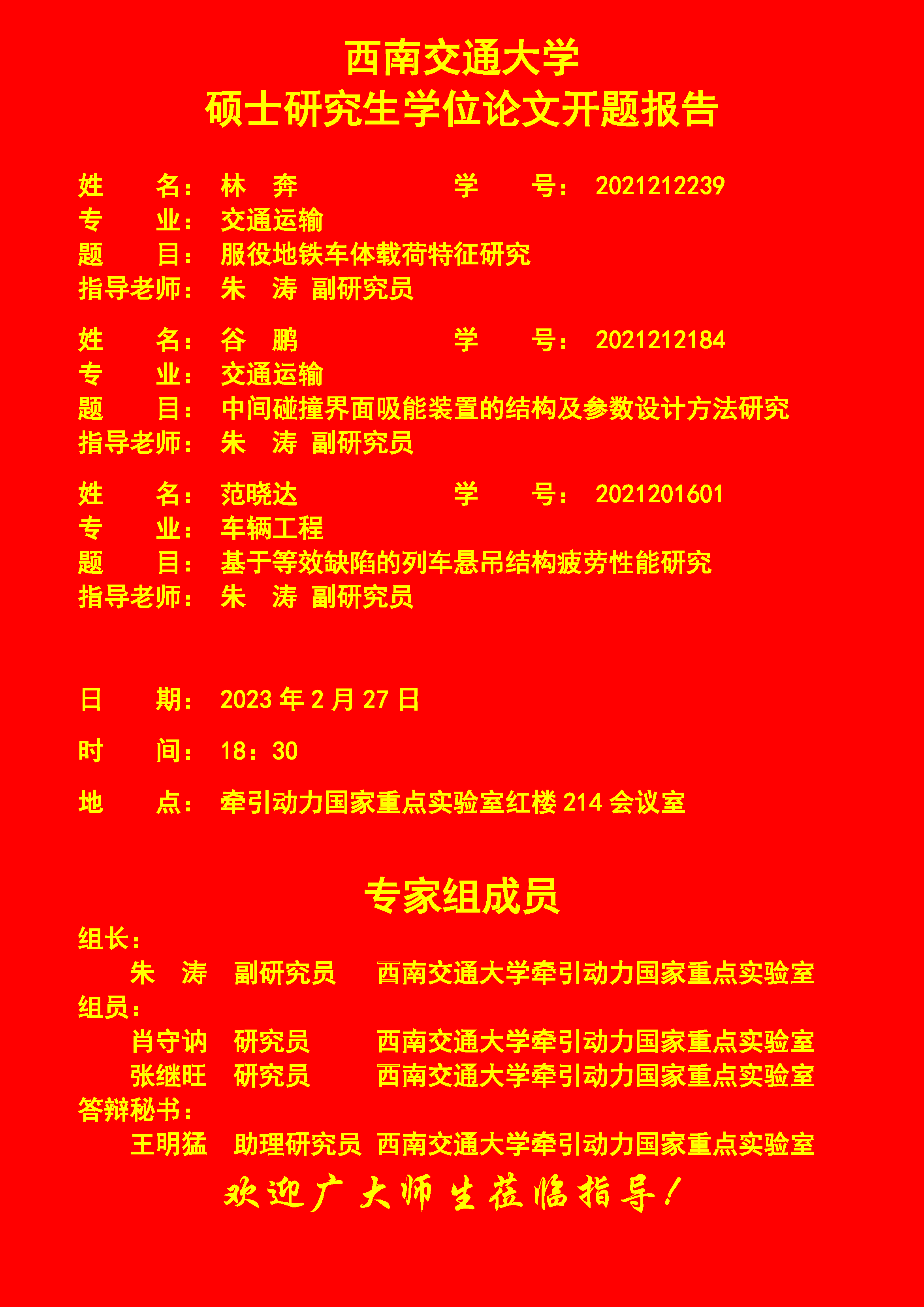 西南交通大学林奔、谷鹏、范晓达硕士研究生开题报告