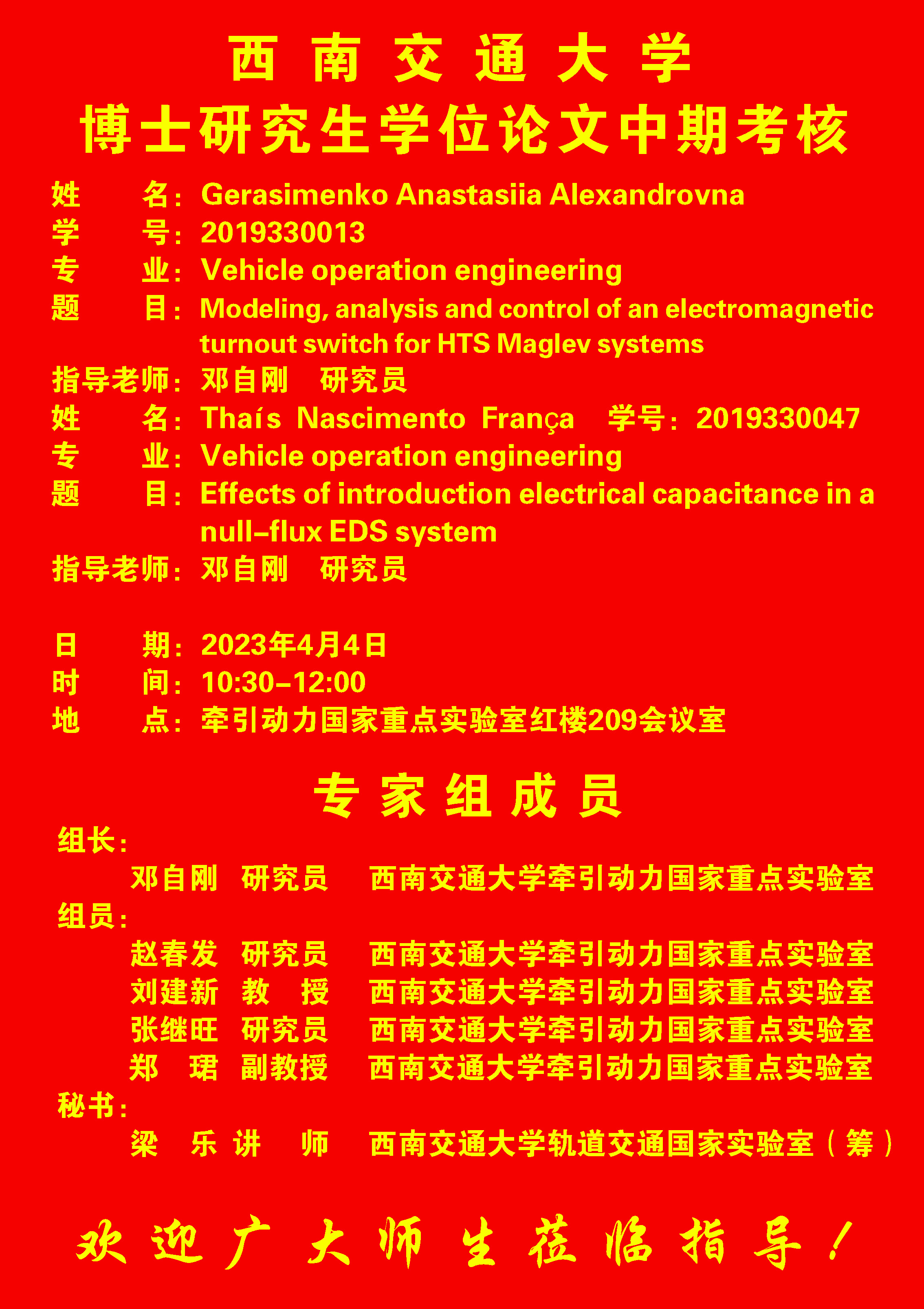 西南交通大学Gerasimenko Anastasiia Alexandrovna博士、Thaís Nascimento França博士学位论文中期考核