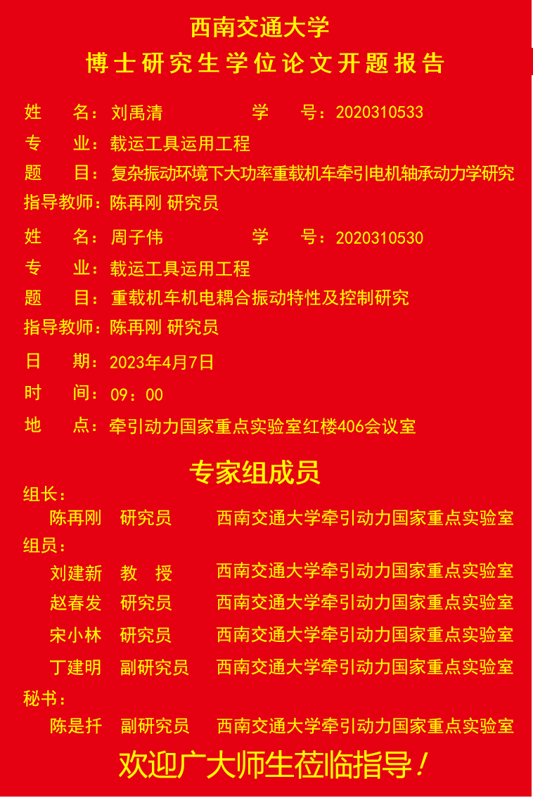 西南交通大学刘禹清博士、周子伟博士学位论文开题报告