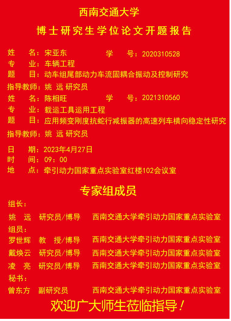 西南交通大学宋亚东博士、陈相旺博士学位论文开题报告