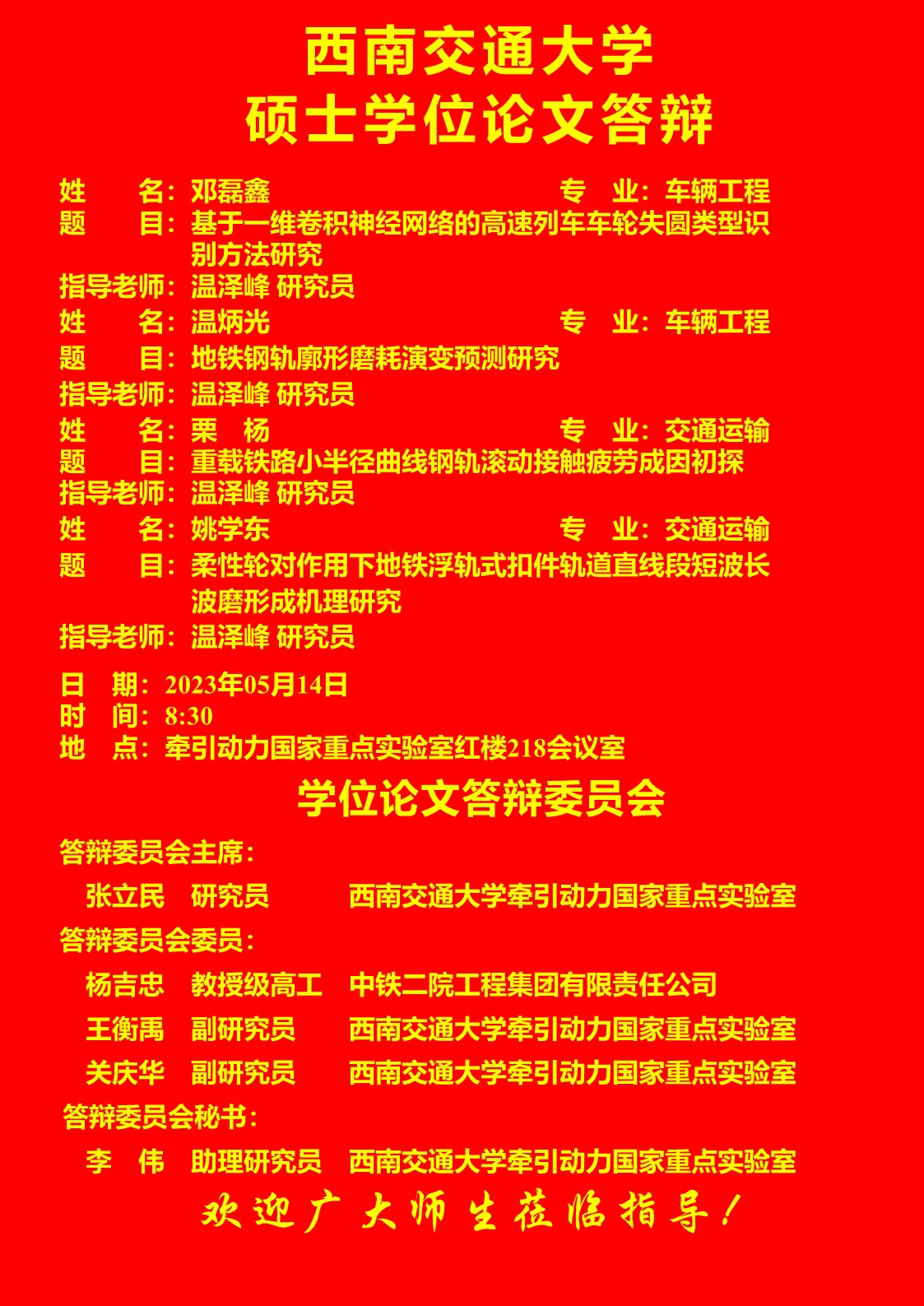 西南交通大学邓磊鑫、温炳光、栗杨、姚学东硕士学位论文答辩