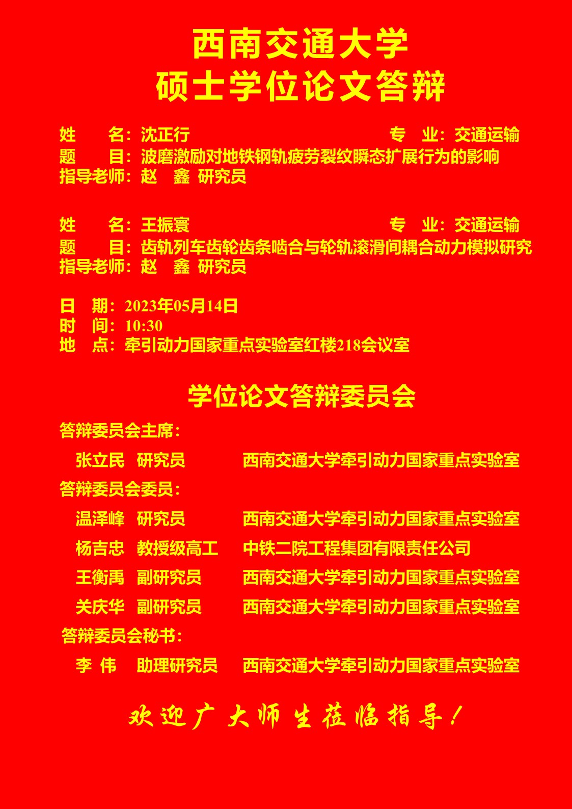 西南交通大学沈正行、王振寰硕士学位论文答辩