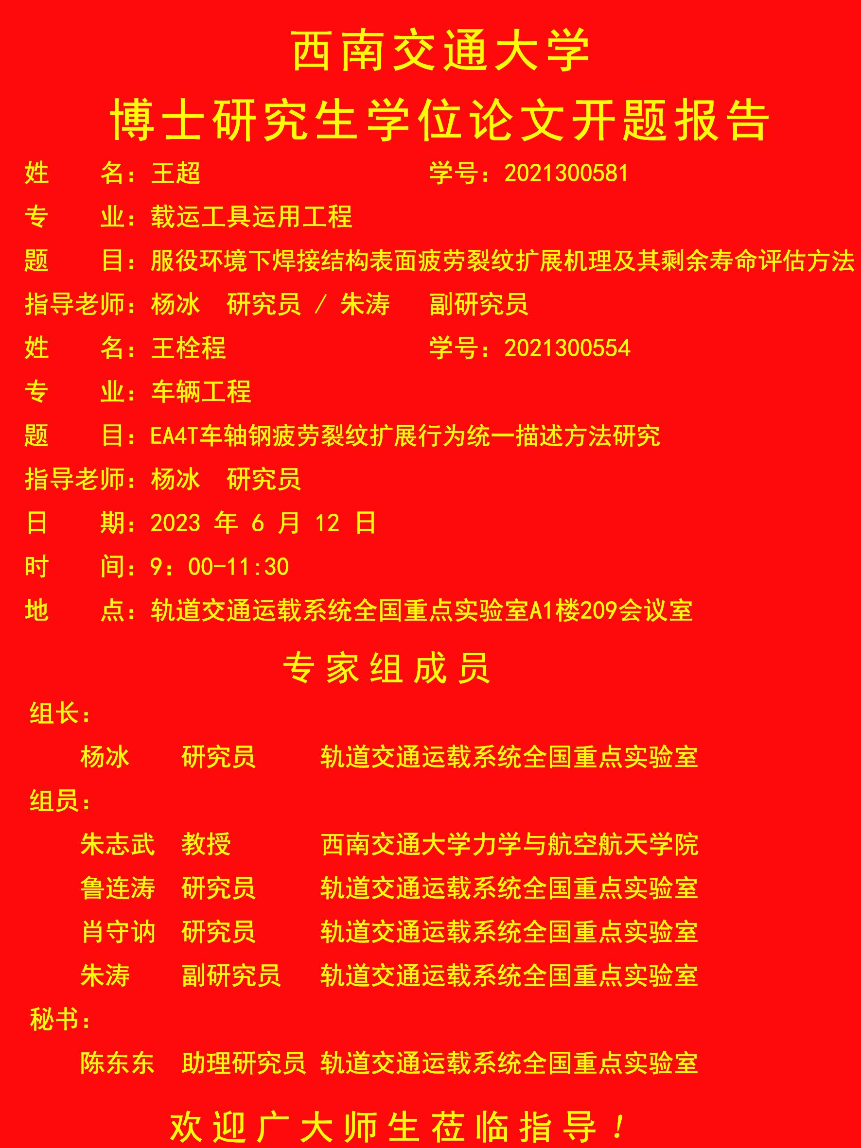 西南交通大学王超博士、王栓程博士学位论文开题报告告
