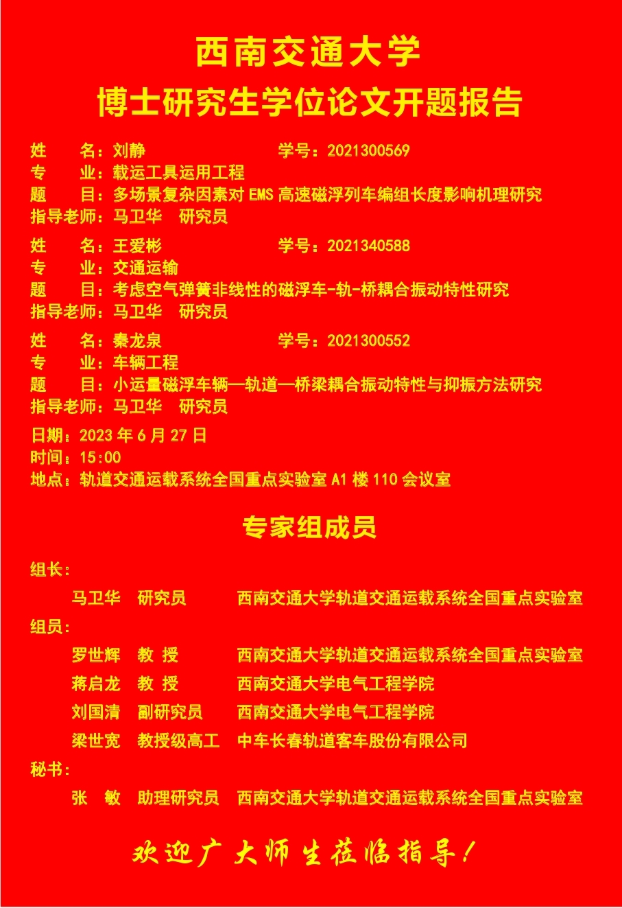 西南交通大学刘静博士、王爱彬博士、秦龙泉博士学位论文开题报告
