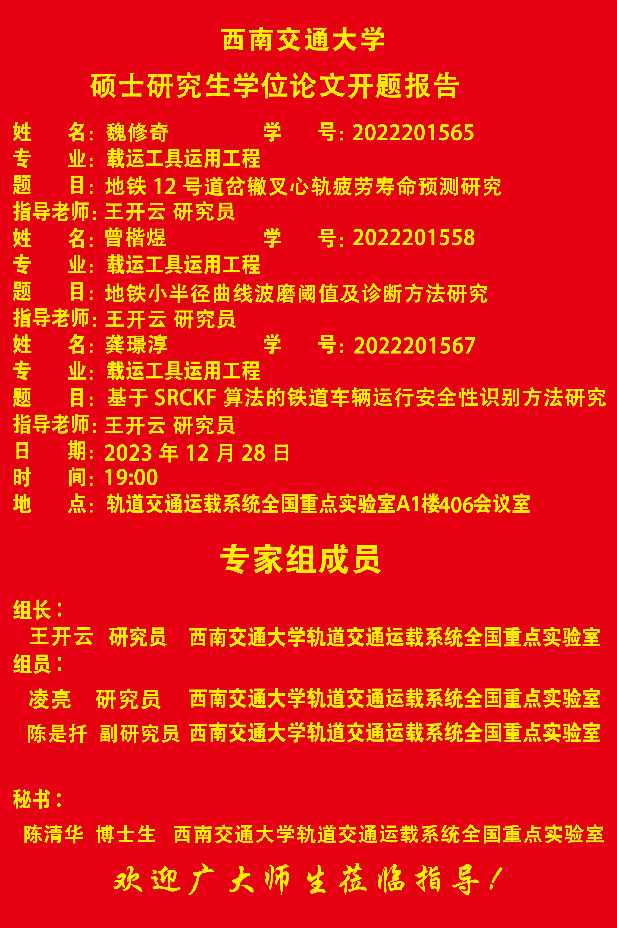 西南交通大学魏修奇、曾楷煜、龚璟淳硕士研究生开题报告