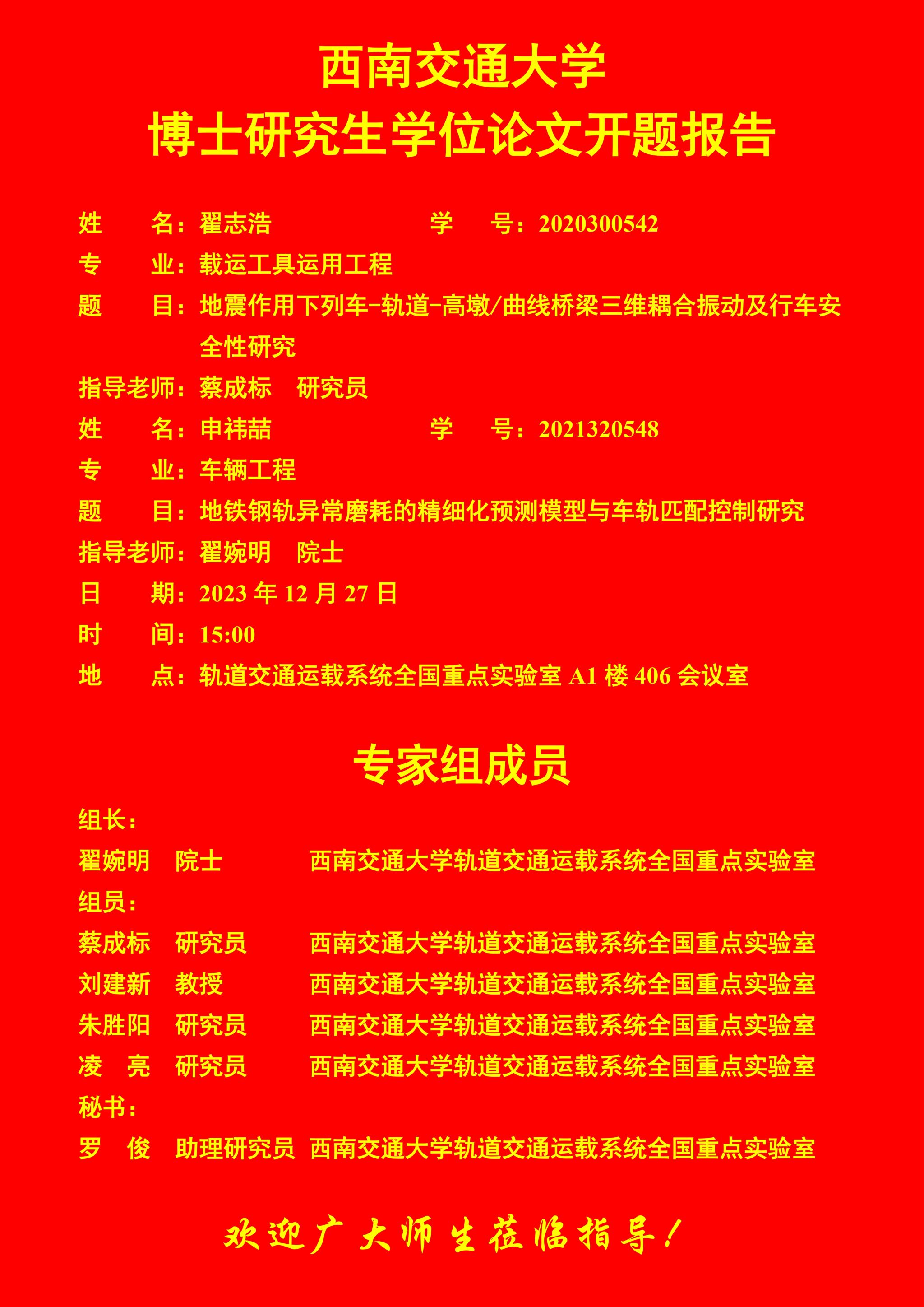 西南交通大学翟志浩博士、申祎喆博士学位论文开题报告