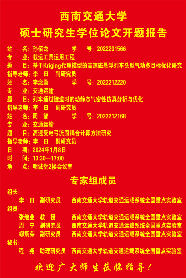 西南交通大学孙佰龙、李念勋、周智硕士研究生开题报告