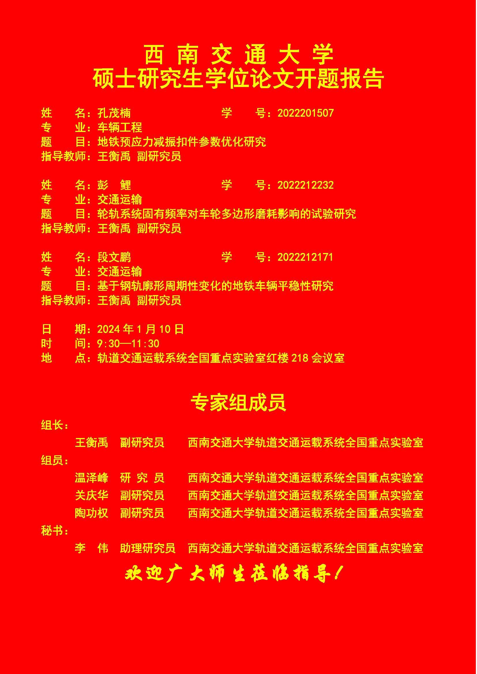 西南交通大学孔茂楠、彭鲤、段文鹏硕士研究生开题报告
