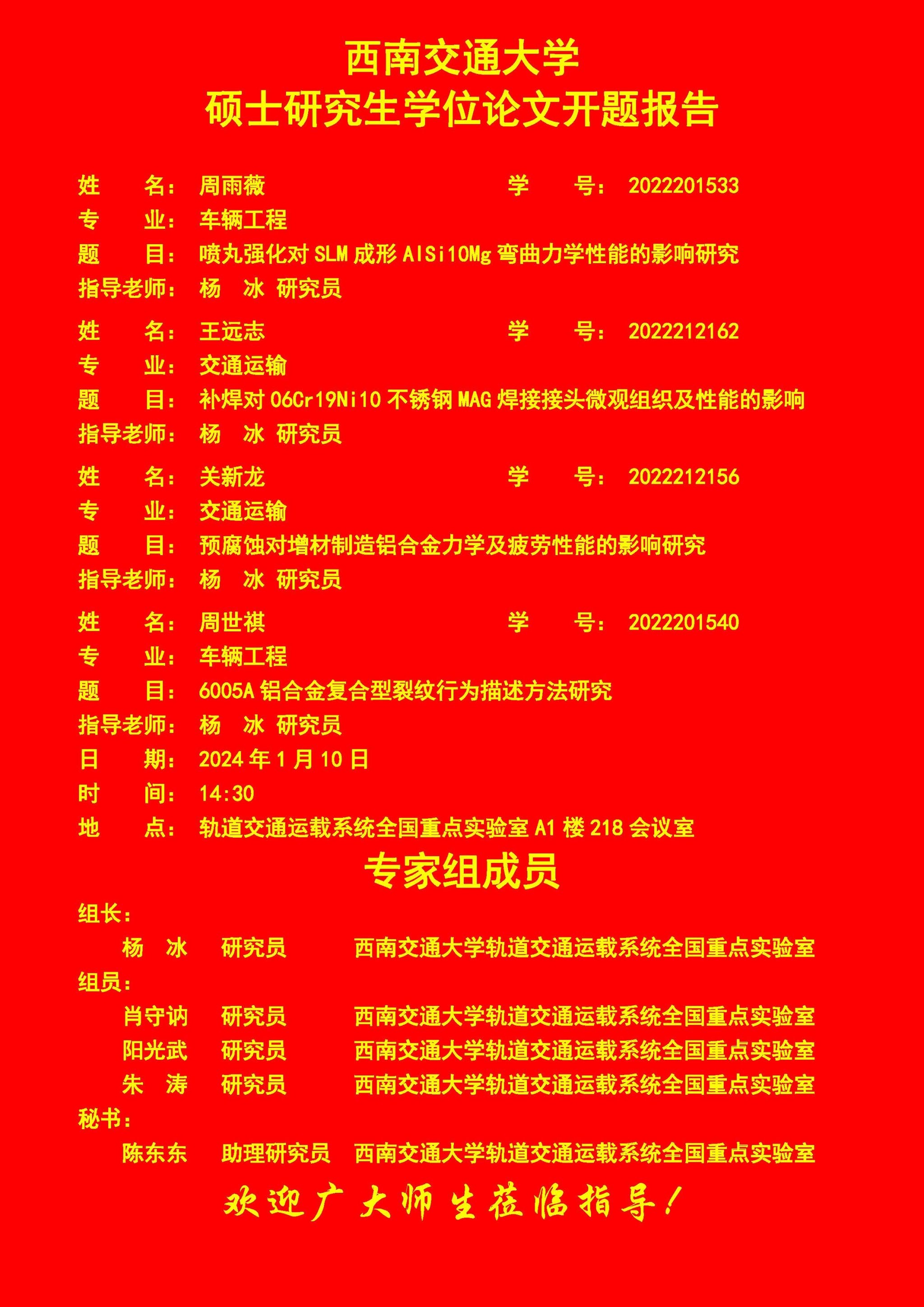 西南交通大学周雨薇、王远志、关新龙、周世祺硕士研究生开题报告