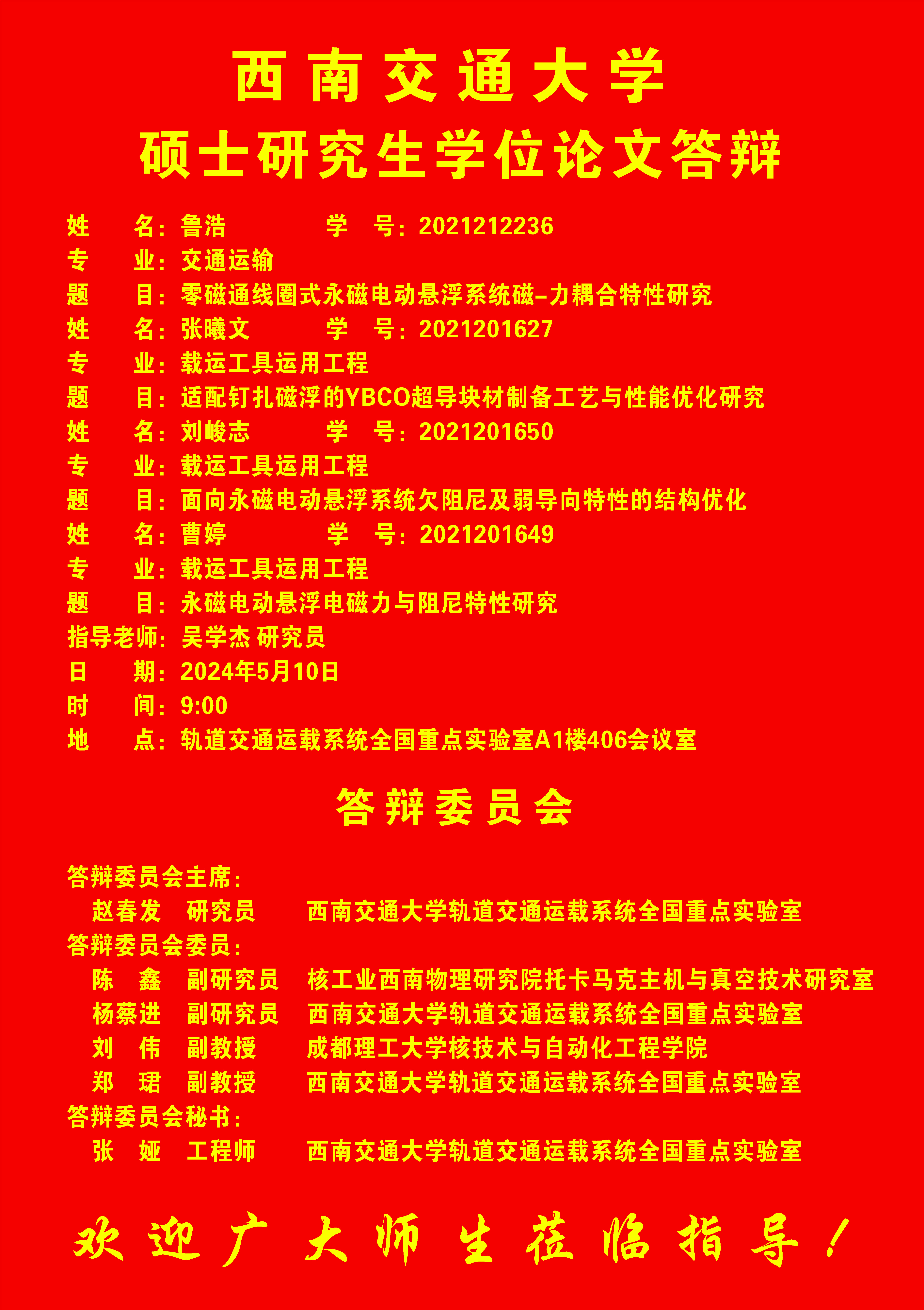 西南交通大学鲁浩、张曦文、刘峻志、曹婷硕士学位答辩